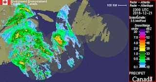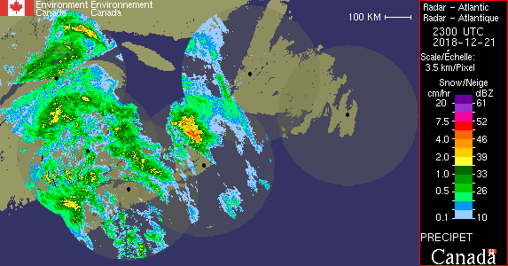 A developing low pressure system over the northeastern United States is forecast to track northward to pass west of the Maritimes tonight and Saturday. Light rain over southwestern Nova Scotia will become heavy at times tonight, then taper to a few showers late in the day Saturday. Total rainfall amounts of 25 to 40 mm are expected with this system with possible higher amounts in areas of heaviest rain.